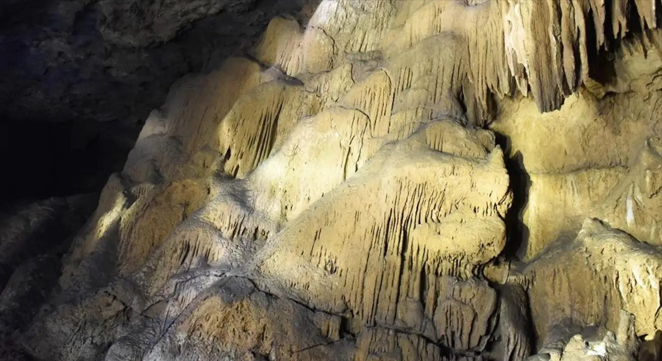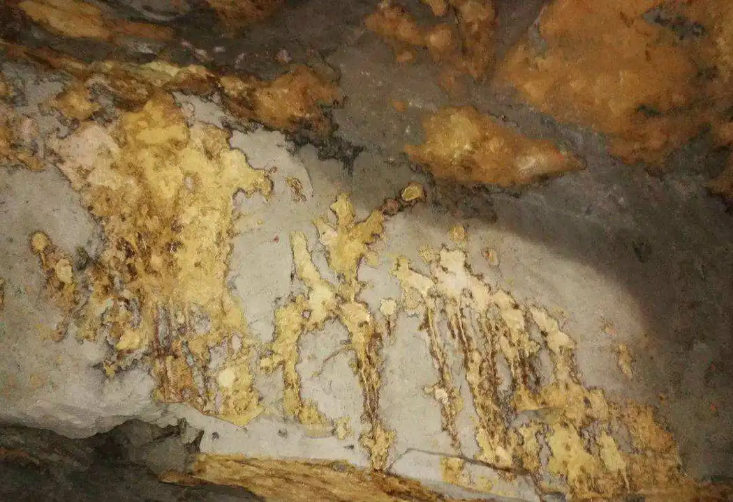 他和记者们一起走进洞里去,发现洞内的石壁上有着斑驳的金色,隐约看来,就和人类的壁画图案一般。